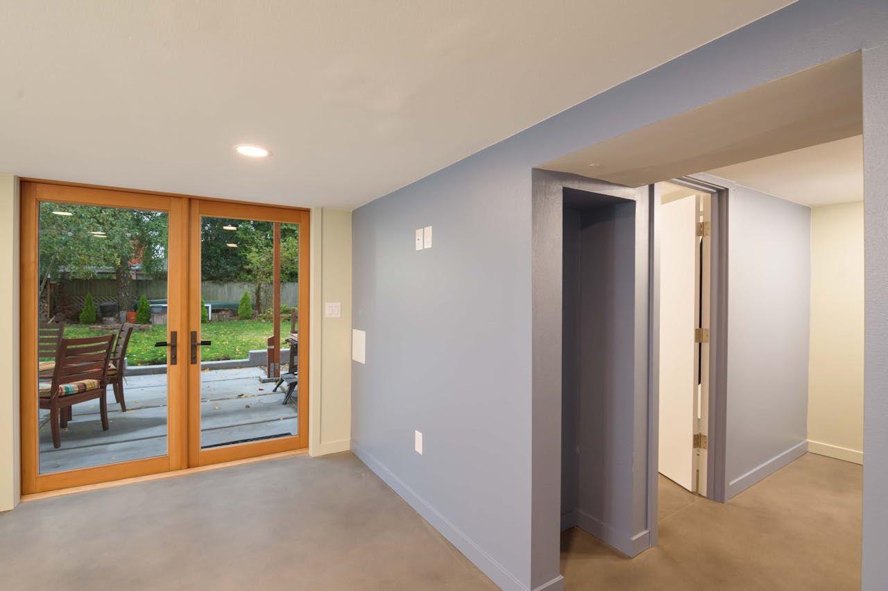 Basement Hallway With French Doors Drywall And Mud Being Added