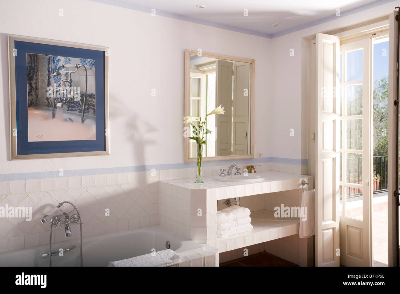 White Bathroom With French Doors And Tons Of Natural Light By Wade
