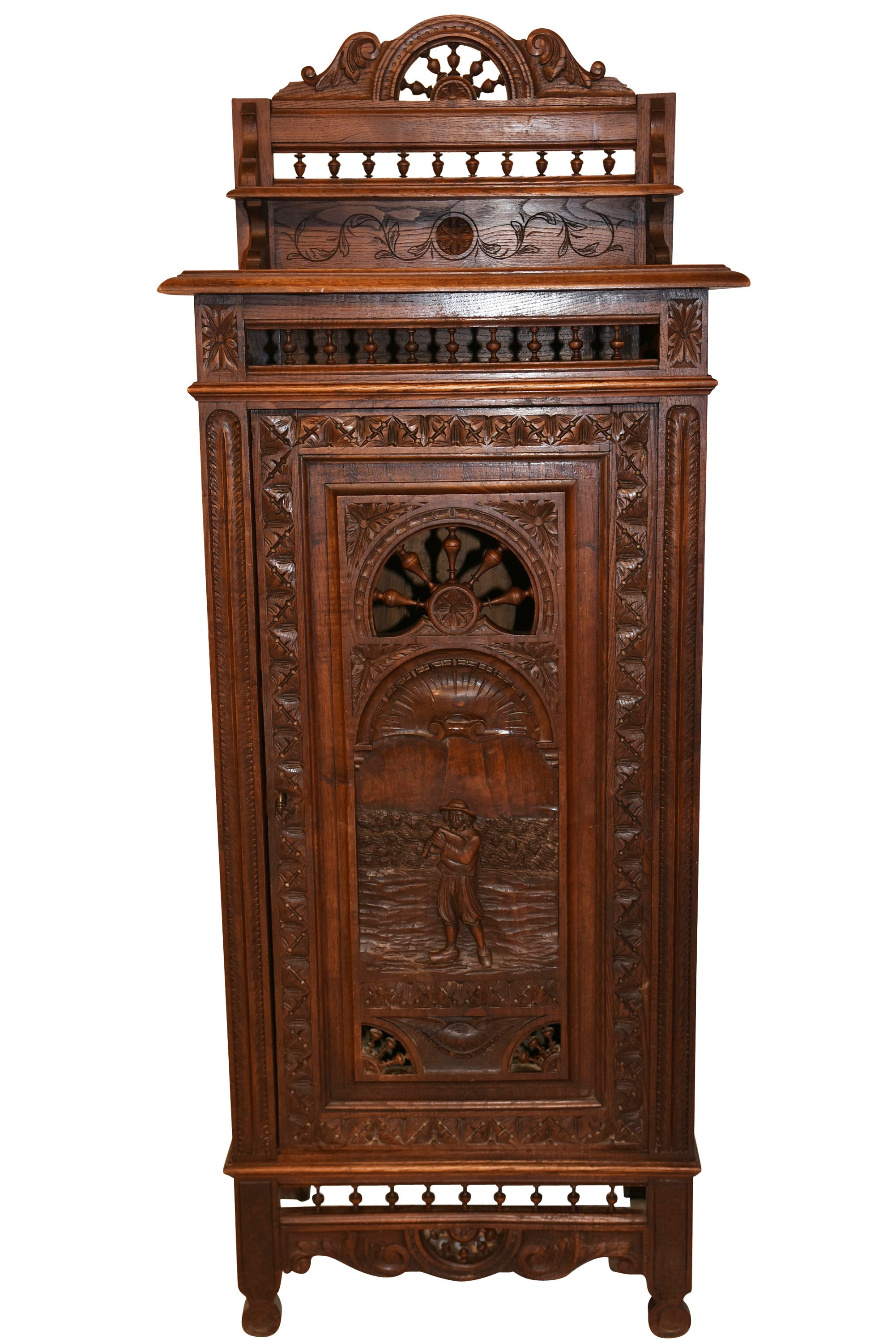 Country Armoire Antique French Tall Narrow Dark Oak Carved Single
